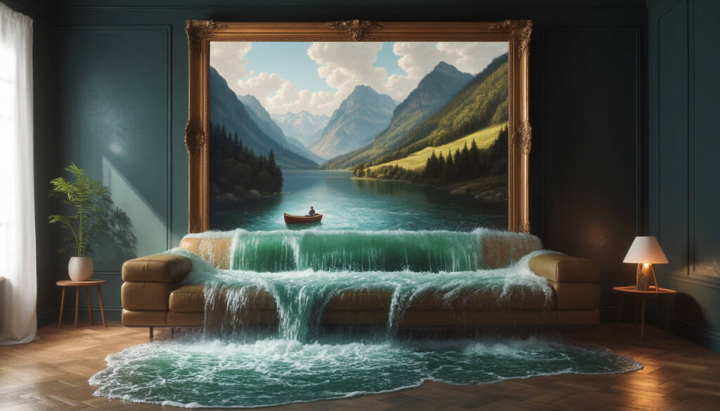 一張超寫實的照片,一條河流從客廳牆上的油畫中漂浮而出,延伸至沙發與木地板之上。這幅畫描繪了一條靜謐的山間河流,一艘小船在水面上輕輕搖晃,緩緩駛入客廳。河岸的邊界延伸至木地板,將藝術世界與現實空間融為一體。客廳裝飾著高雅的家具與溫馨的氛圍,宛如一幕電影場景或攝影作品。