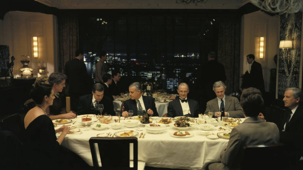 擺滿白色桌子的宴會廳,賓客們圍坐其中,正享用一頓精緻的美食。