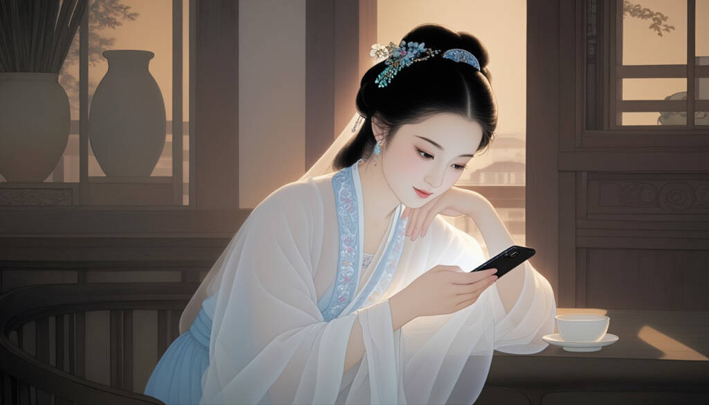 工筆畫風格的林黛玉,身穿唐代服飾,坐在咖啡館的一隅,手中拿著一部智慧型手機,側身迎著逆光,神情優雅而恬靜。