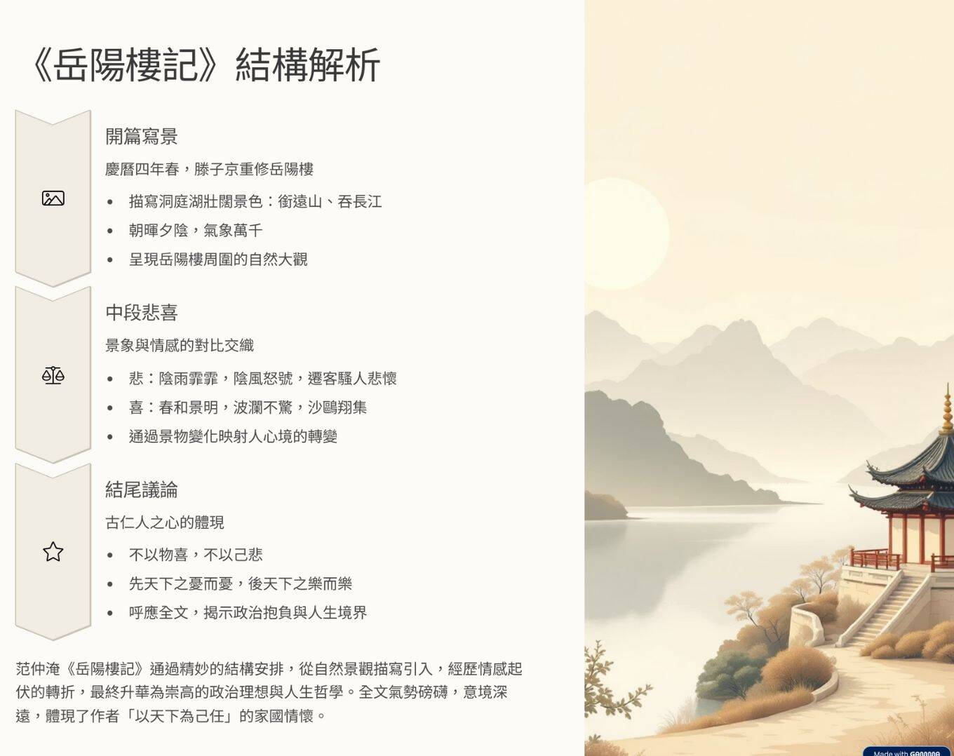 生成一頁《岳陽樓記》的結構解析簡報,用橫向流程圖方式,分為三段:開篇寫景、中段悲喜、結尾議論。圖表風格簡單明瞭,搭配古典風邊框,背景可用淡色宣紙質感。